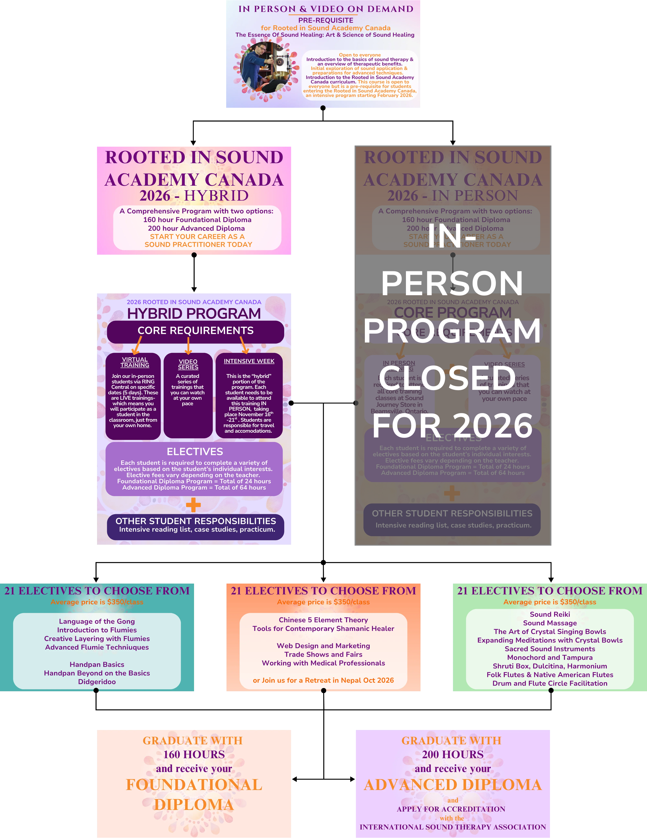 • Rooted in Sound Academy Canada gives you a complete list of all the subjects that you will be learning, including course descriptions,  objectives and information about your teacher. You can follow the links here see all the dates and details for In-person option and the Hybrid option.